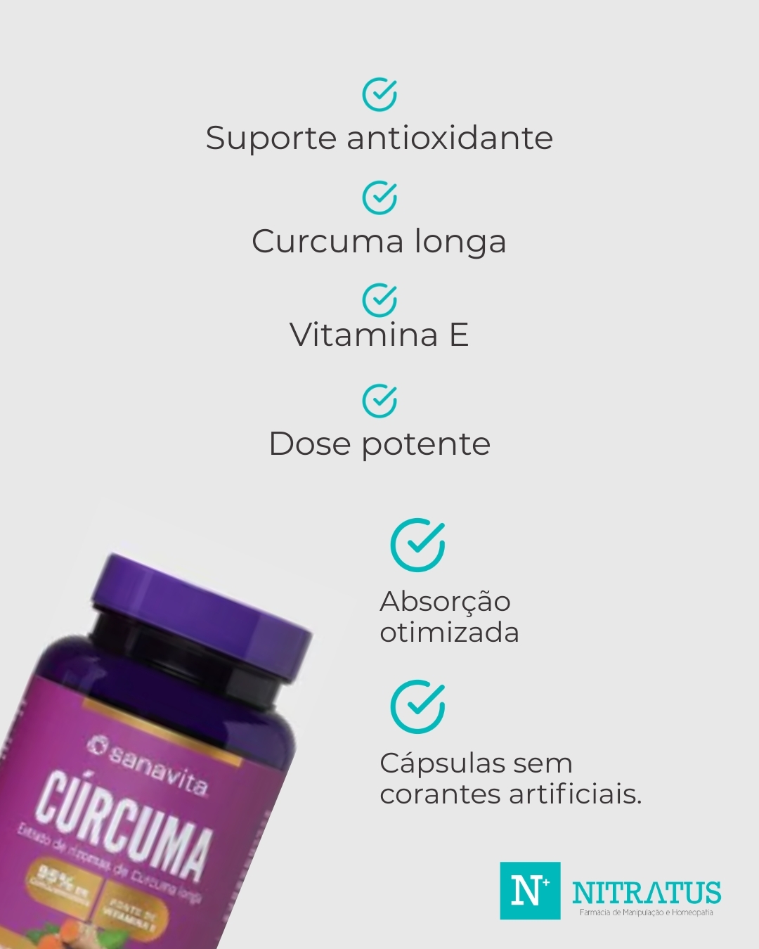 SANAVITA CURCUMA 60CAPS Início R$ 117,00 2x de R$ 58,50 - + A Cúrcuma da Sanavita é um suplemento com extrato de Curcuma longa, que fornece 130 mg de curcumina por cápsula, a dose máxima aprovada pela Anvisa. A curcumina, um potente bioativo polifenol, é conhecida por suas propriedades antioxidantes e benefícios para o bem-estar geral. O extrato é concentrado em curcuminoides (95%) e está combinado com uma matriz oleosa para melhorar a absorção. A fórmula também é enriquecida com vitamina E (alfa-tocoferol), que potencializa o efeito antioxidante da curcumina. Inúmeras evidências científicas têm validado o poder do extrato de cúrcuma para a saúde, sendo que na medicina Ayurveda indiana, ele é utilizado há cerca de 6 mil anos. A cúrcuma é uma escolha eficaz para quem busca suporte antioxidante e equilíbrio para o organismo. Consulte o prazo de entrega e frete do pedido Carregando... Entrega Rápida em todo Brasil Parcelamento até 2x sem juros no cartão de crédito Pix pagamento fácilprático e seguro Segurança Site 100% seguro